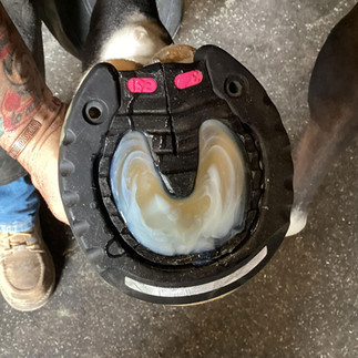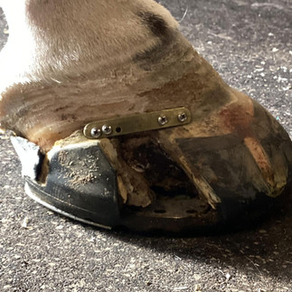 The first images are the day of resection. Second set of images is five weeks for a follow up shoeing. I chose the heart insert in the glue shoe with a pour on second application being we did get a substantial amount of growth in the first rotation. There would be no longer need for access through a hospital plate in this next rotation.